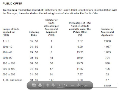 The balloting ratios s quite weird. The chances decreases as the banding increases and then rises as it moves to the higher bands. On the highest band, investors had a 80% chance to be allocated units. Again, we see so many millionaires on this banding.